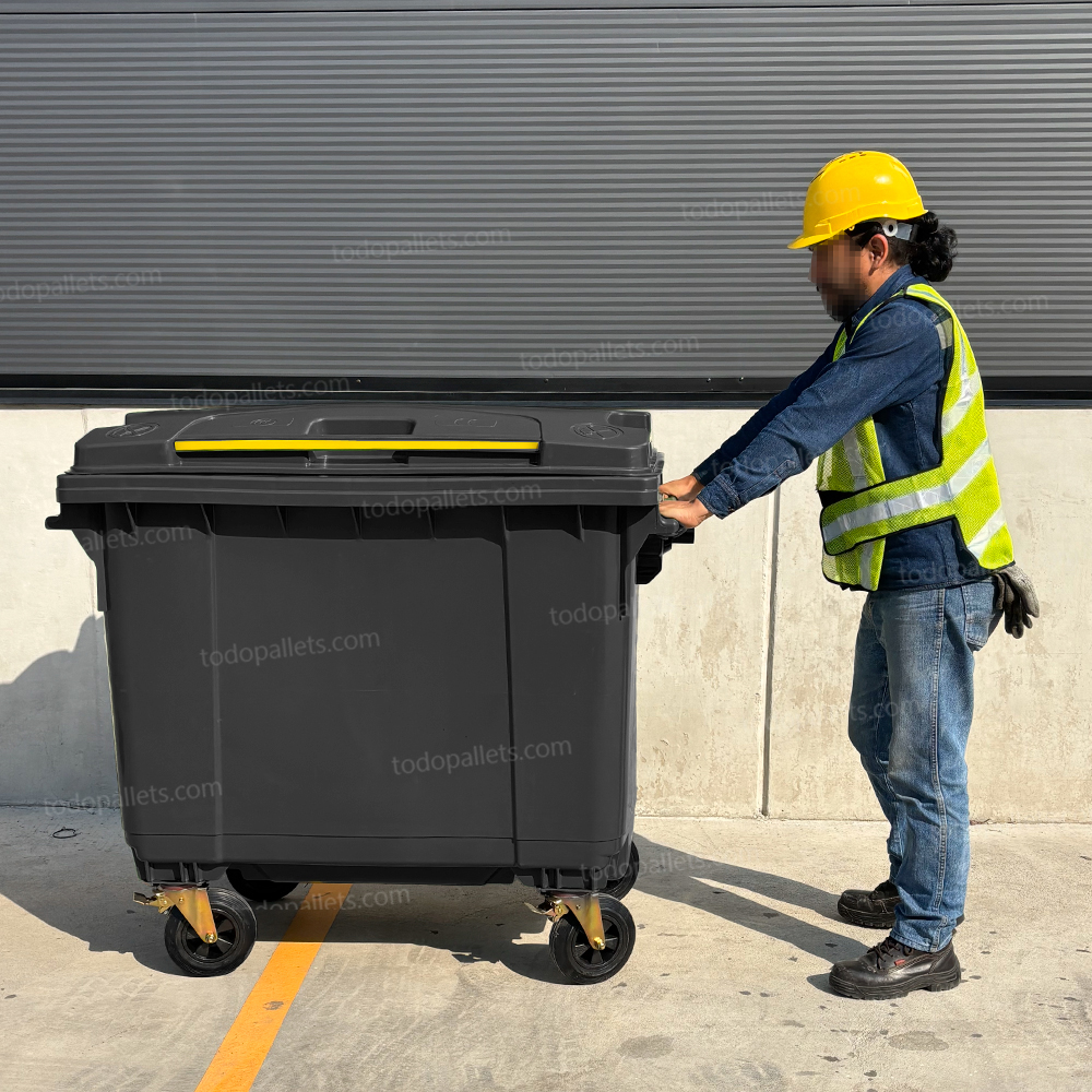 Contenedor de plástico de 1100 litros en color negro, fabricado en HDPE moldeado por inyección de alta presión. Cuenta con cuatro ruedas de caucho sólido, dos de las cuales están equipadas con frenos para un manejo seguro. Su estructura reforzada permite la recolección mecanizada, y su material resistente a cambios de temperatura y productos químicos asegura una durabilidad prolongada.