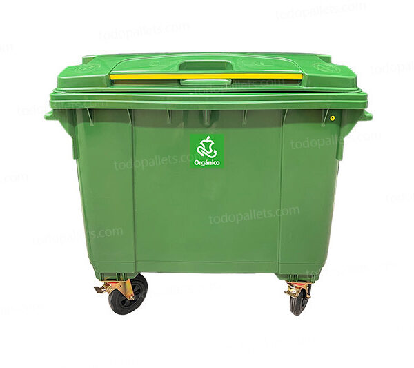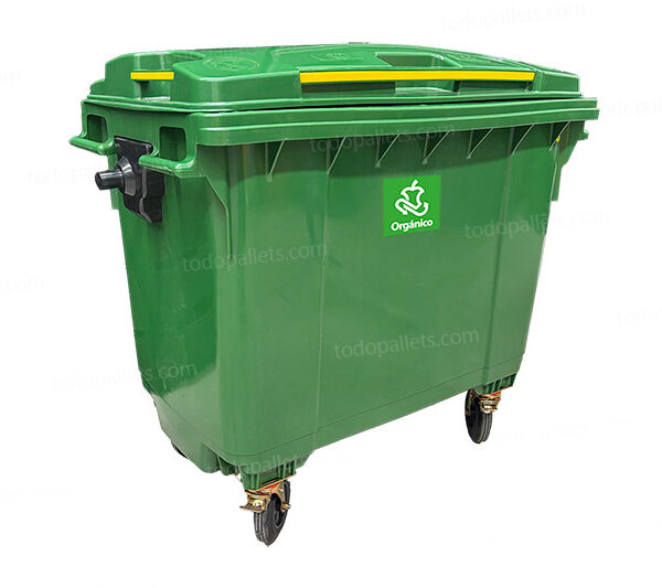 Contenedor de plástico de 1100 litros en color verde, fabricado en HDPE moldeado por inyección de alta presión. Cuenta con cuatro ruedas de caucho sólido, dos de las cuales están equipadas con frenos para un manejo seguro. Su estructura reforzada permite la recolección mecanizada, y su material resistente a cambios de temperatura y productos químicos asegura una durabilidad prolongada.