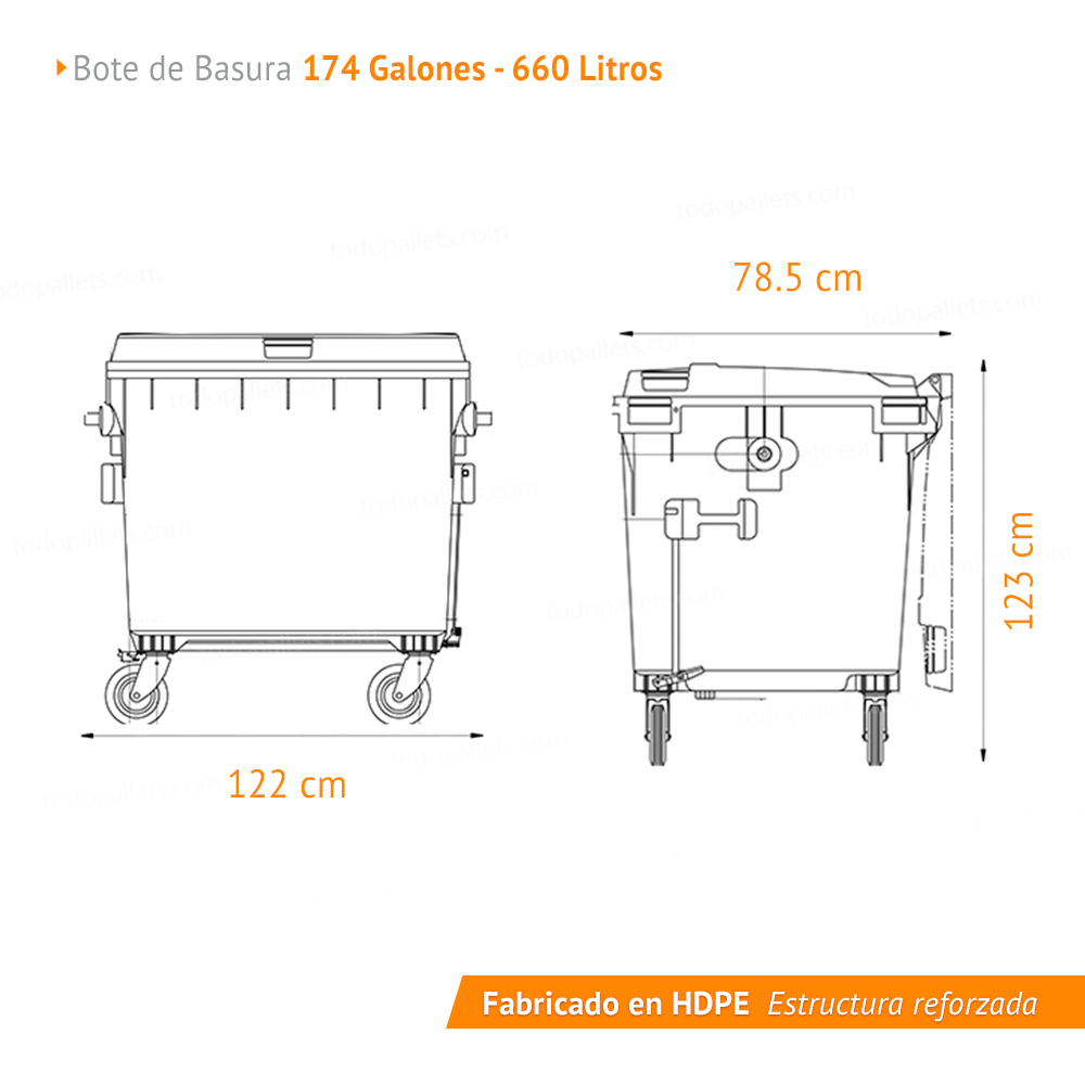 Con una capacidad de 660 litros, este bote de basura es perfecto para áreas que generan grandes cantidades de residuos